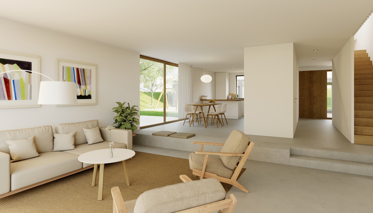 Organisée sur 3 niveaux, chaque habitation possède, au rez-de-chaussée, un généreux espace de vie parfait pour recevoir les amis ou la famille. Le jardin se veut une prolongation de cet espace, séparé uniquement par une large baie vitrée.